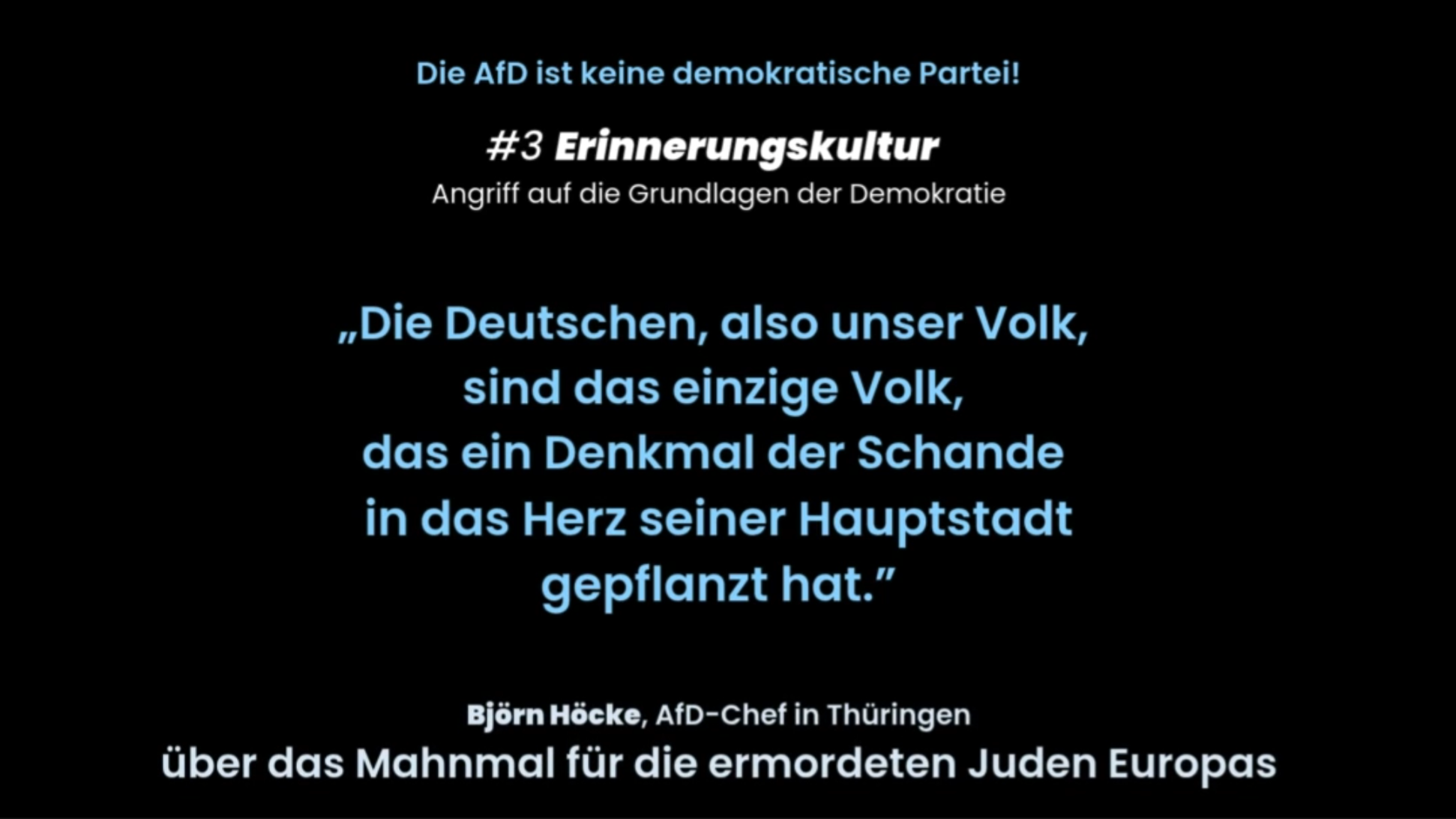 Die AfD verhöhnt die Aufarbeitung der NS-Zeit, spricht vom „Schuldkult“ und fordert eine „erinnerungspolitische Wende“. Damit greift sie die Grundlage unserer Demokratie an: das Bekenntnis zur Menschenwürde und zu den Lehren aus der Geschichte. Diese Haltung ist kein Ausrutscher, sondern gezielte Strategie, die Erinnerungskultur umzudeuten – weg von Verantwortung, hin zu nationalistischen Narrativen.